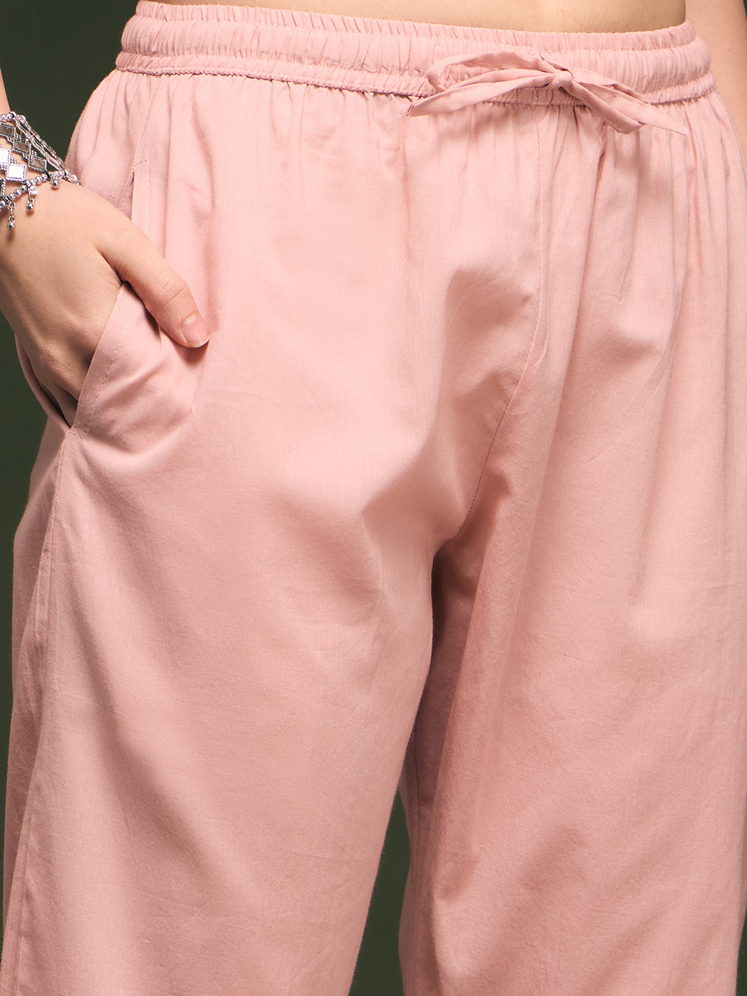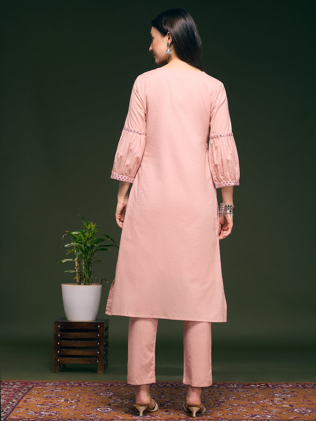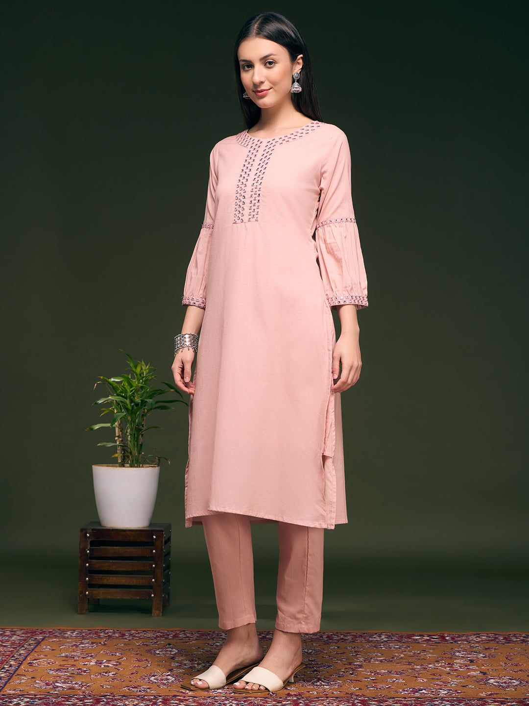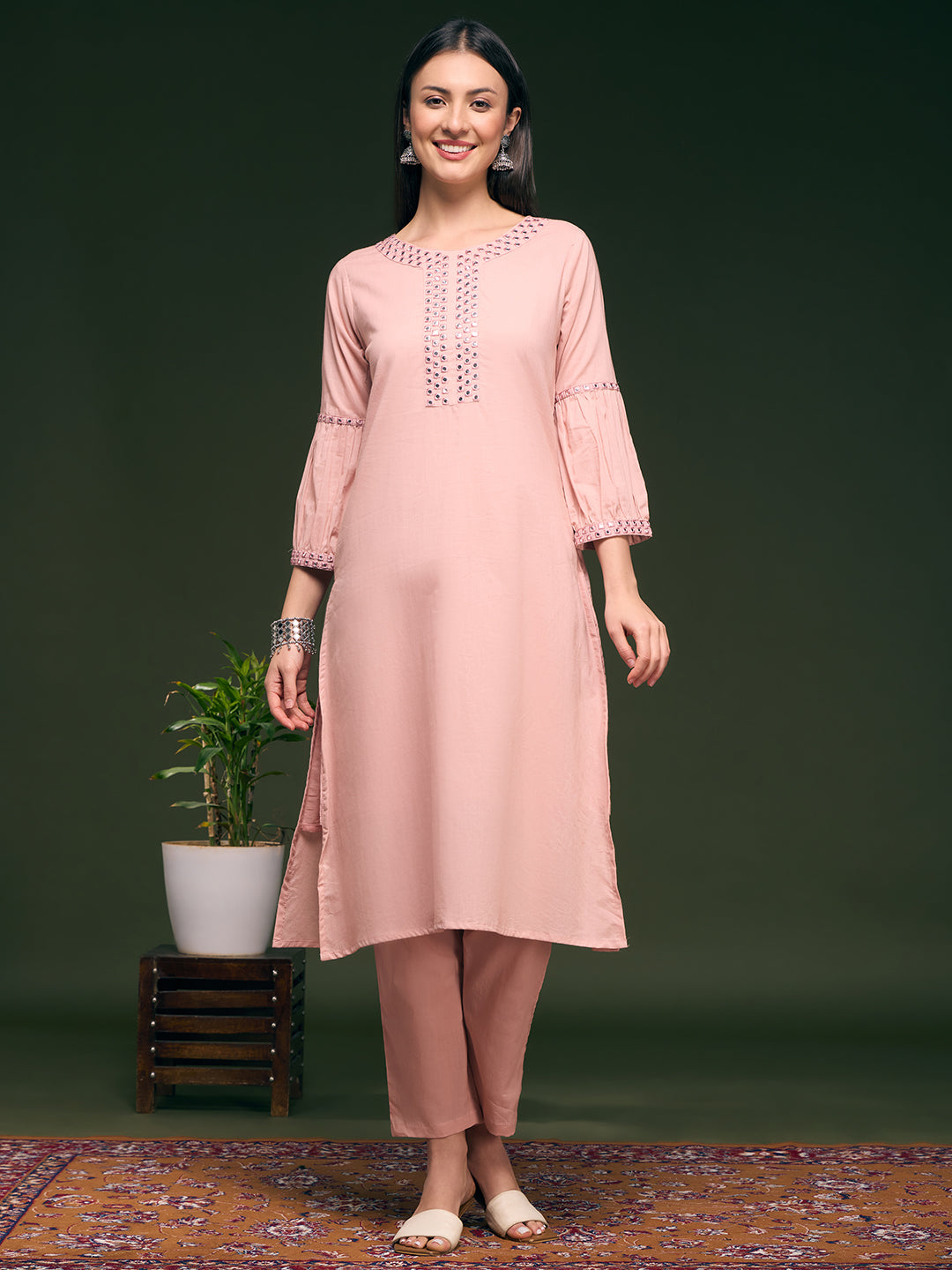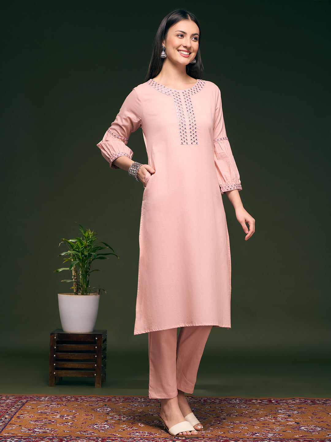 Solid Mirror Work Embroidered Straight Fit Co-ord Set - Pink