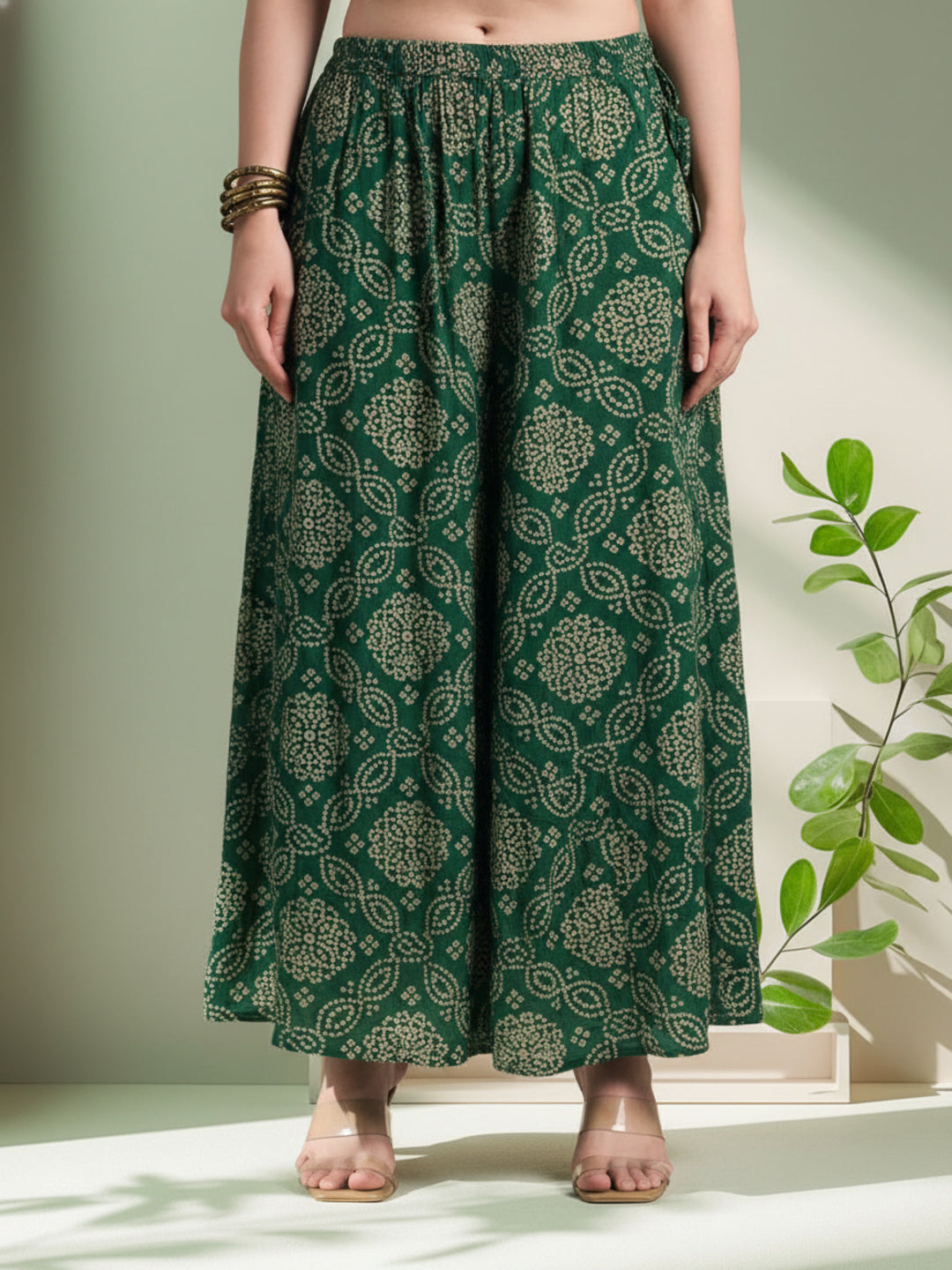 A graceful three-piece suit set featuring a viscose rayon kurta adorned with intricate mirror work embroidery and bandhani print applique work detailing, and delicate mirror-embroidered bootas allover. Designed with side slits and dori tassels for fluid movement, paired with a flared printed palazzos and a coordinated printed dupatta- perfect for occasion wear yet easy to style for everyday traditional elegance.