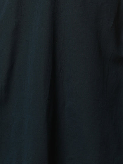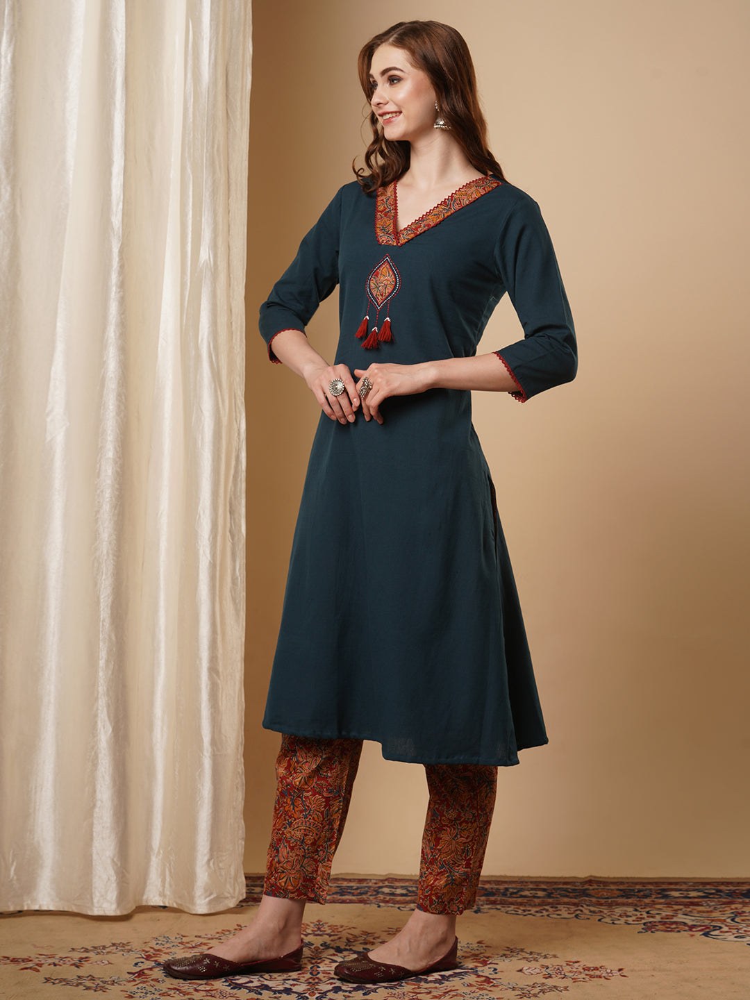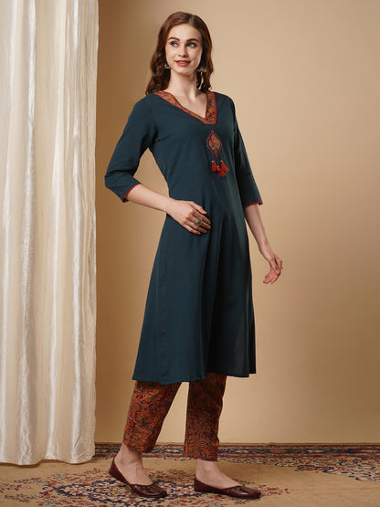 Solid Parchwork A-line Flared Cotton Flax Kurta with Printed Pant - Blue