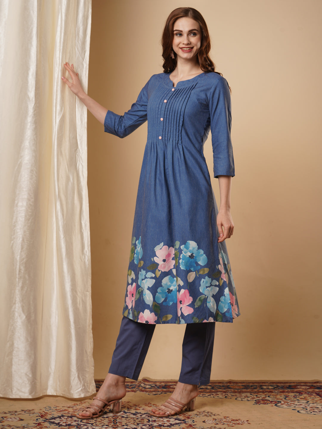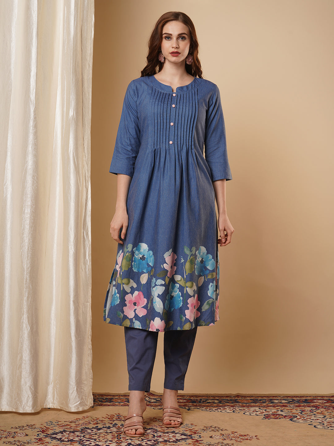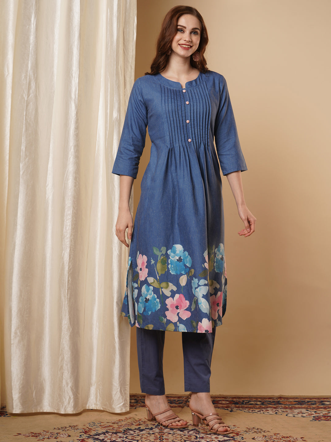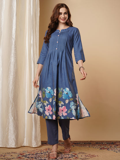 Solid Pin Tucked & Floral Printed Hem A-line Kurta with Pant - Blue