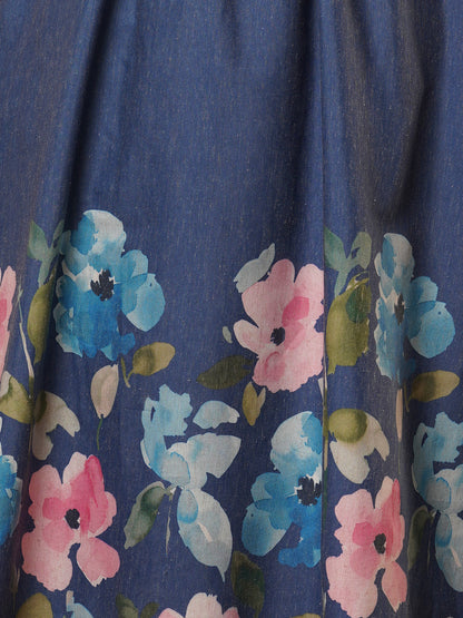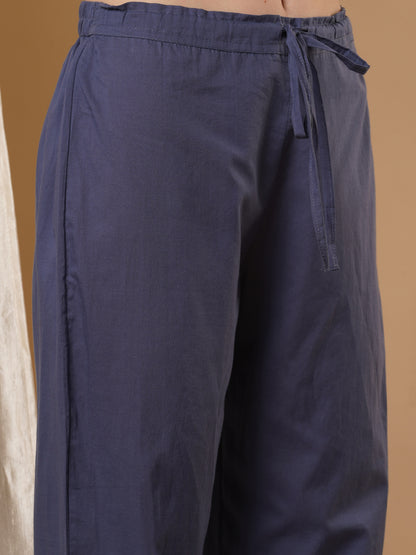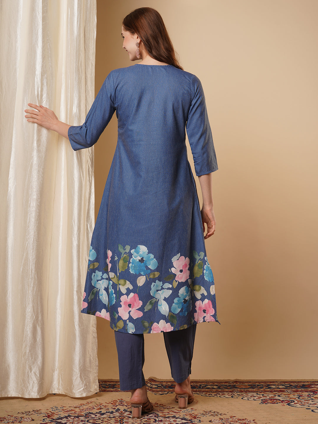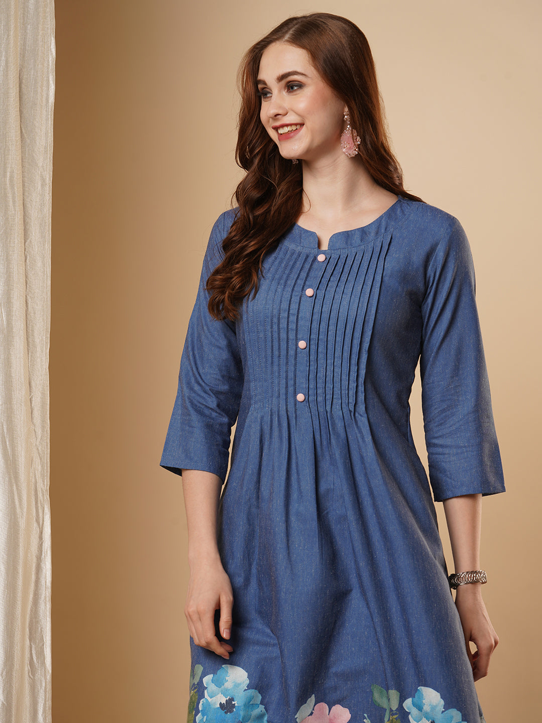 Solid Pin Tucked & Floral Printed Hem A-line Kurta with Pant - Blue