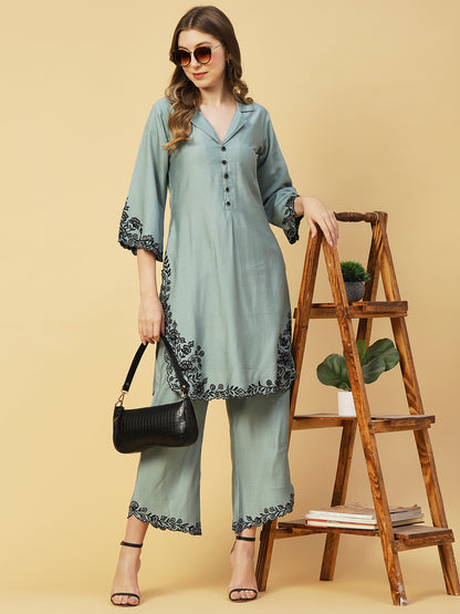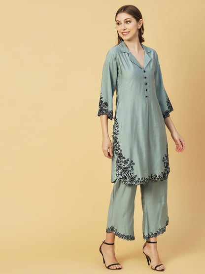 Solid Resham Cutwork Embroidered Kurta With Cutwork Embroidered Pants - Slate Green