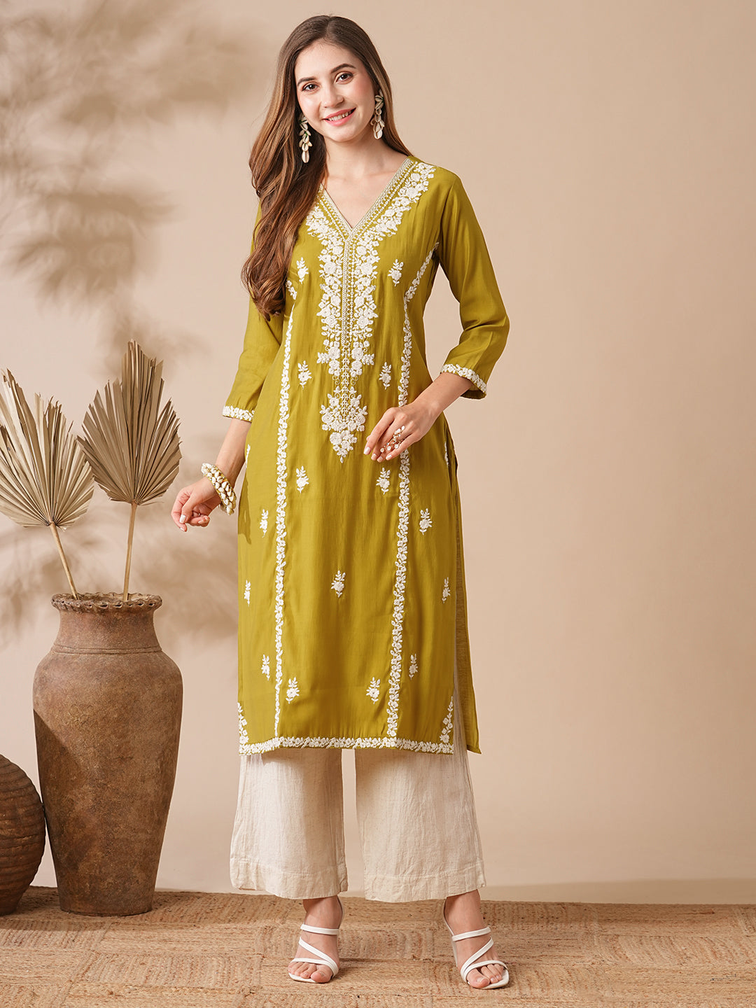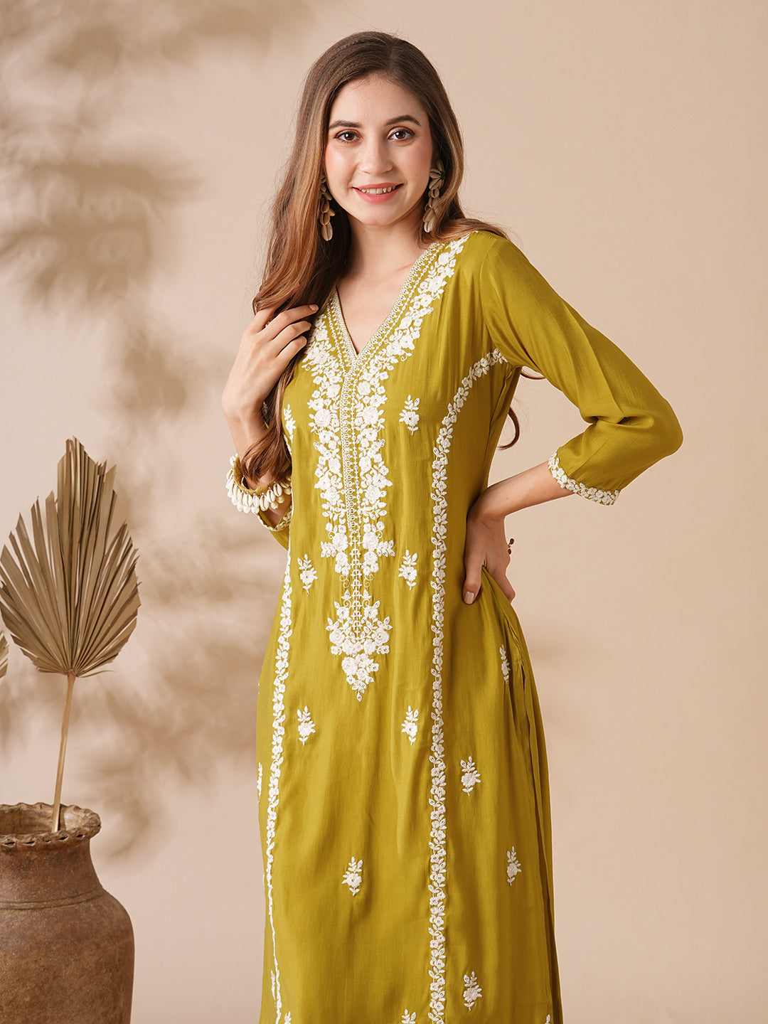 Solid Resham & Sequins Floral Embroidered Kurta - Lime Yellow