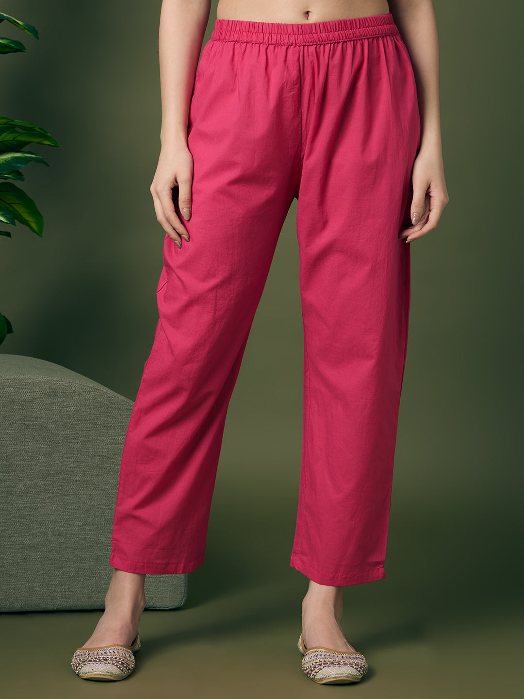 Make a striking statement in this Pink Anarkali set, featuring intricate schiffli floral embroidery on soft cotton fabric. Designed with a flattering V-neckline and paired with a solid pant and pure cotton printed dupatta, it’s the perfect blend of tradition and timeless style.