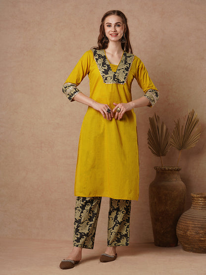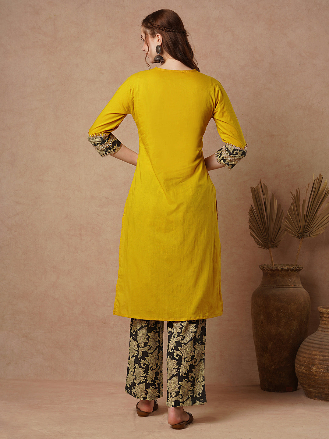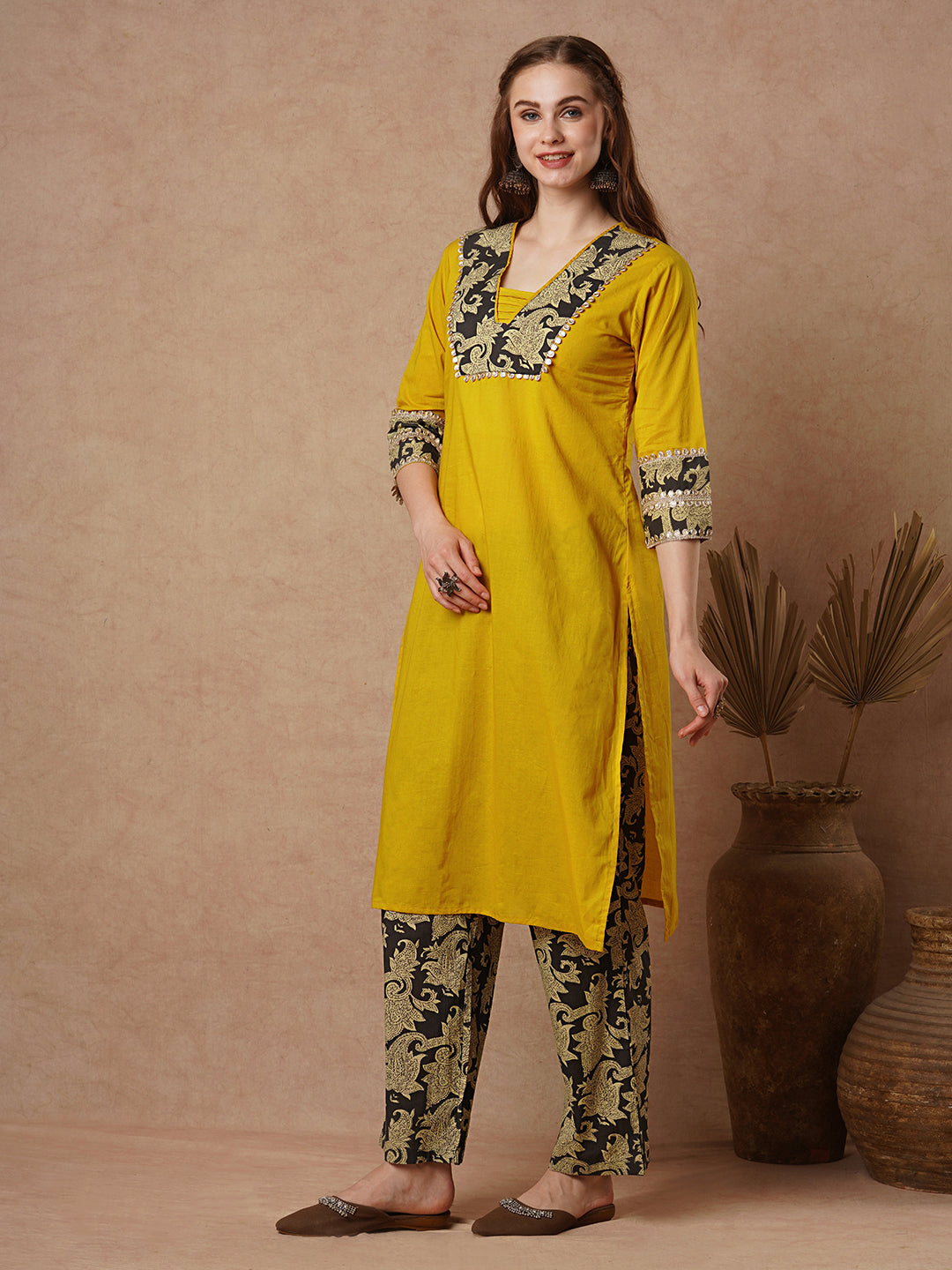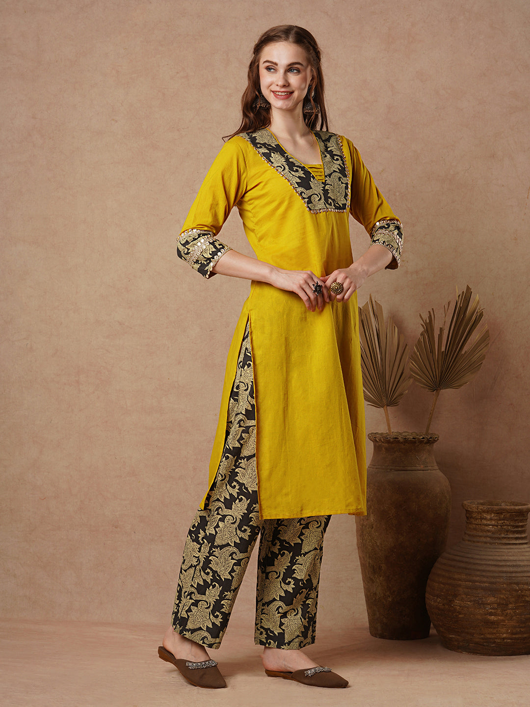 Solid Sequin Embellished Straight Kurta with Floral Printed Palazzo - Yellow