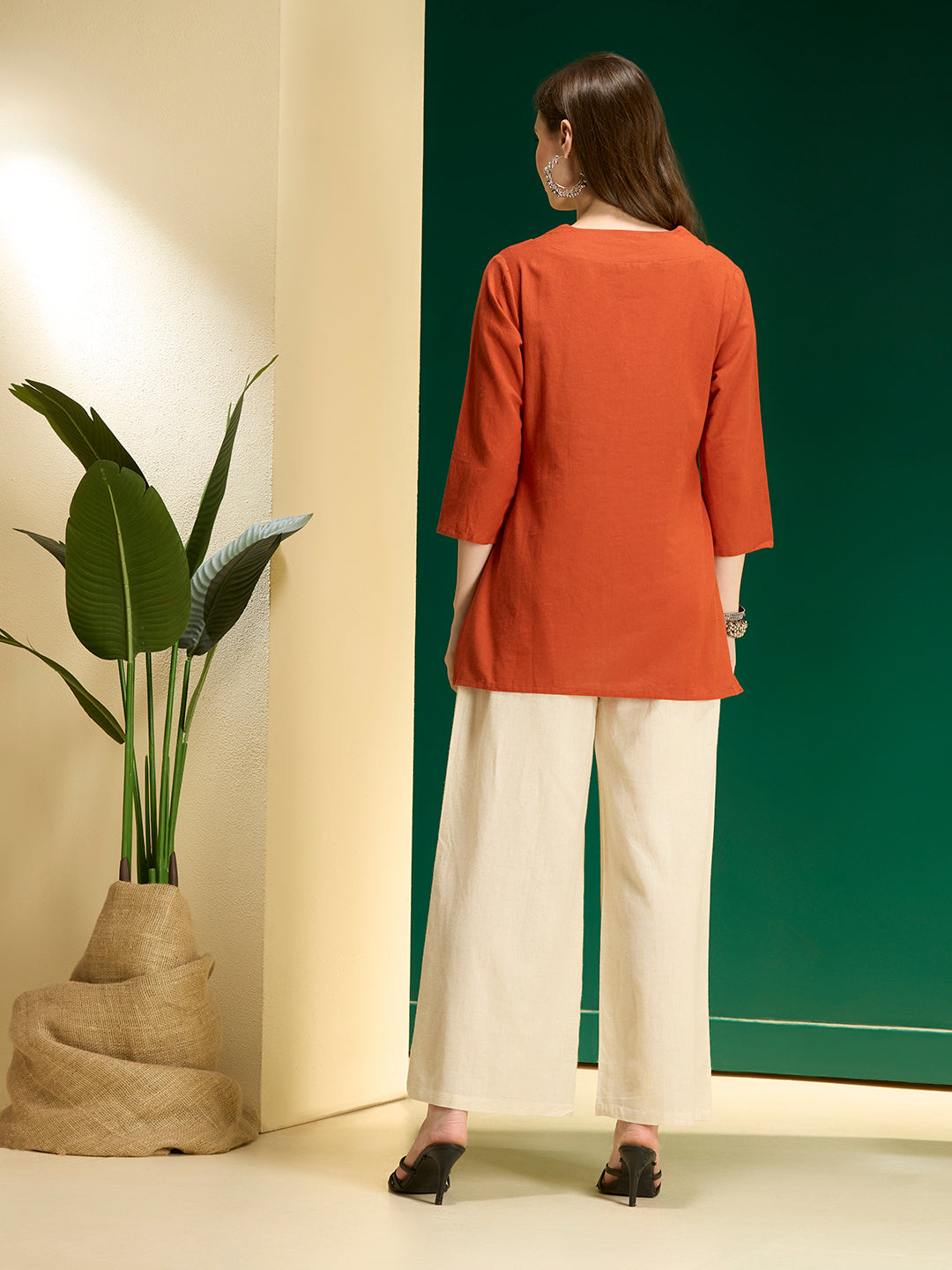 Solid Straight Fit Top with Floral Patchwork Palazzo - Orange
