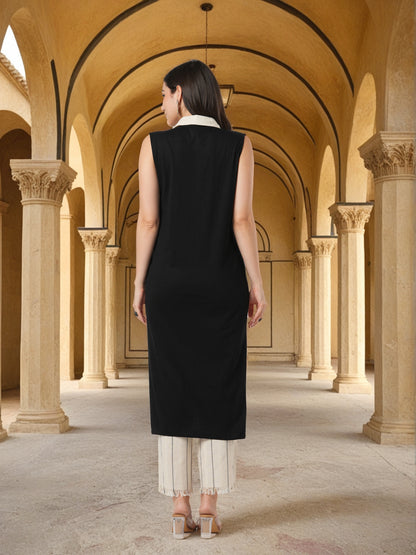 -Effortlessly chic and contemporary, this off-white co-ord set redefines elegance with its unique design. The kurta, crafted from soft cotton flax, features a solid front in a classic off-white hue, while the back is adorned with intricate knitted black thread detailing for a bold contrast. The set is completed with matching palazzo pants, featuring stylish fringe detailing at the hems for an added touch of flair. A sharp shirt collar finishes the look, making this co-ord set perfect for both casual and semi-formal occasions.