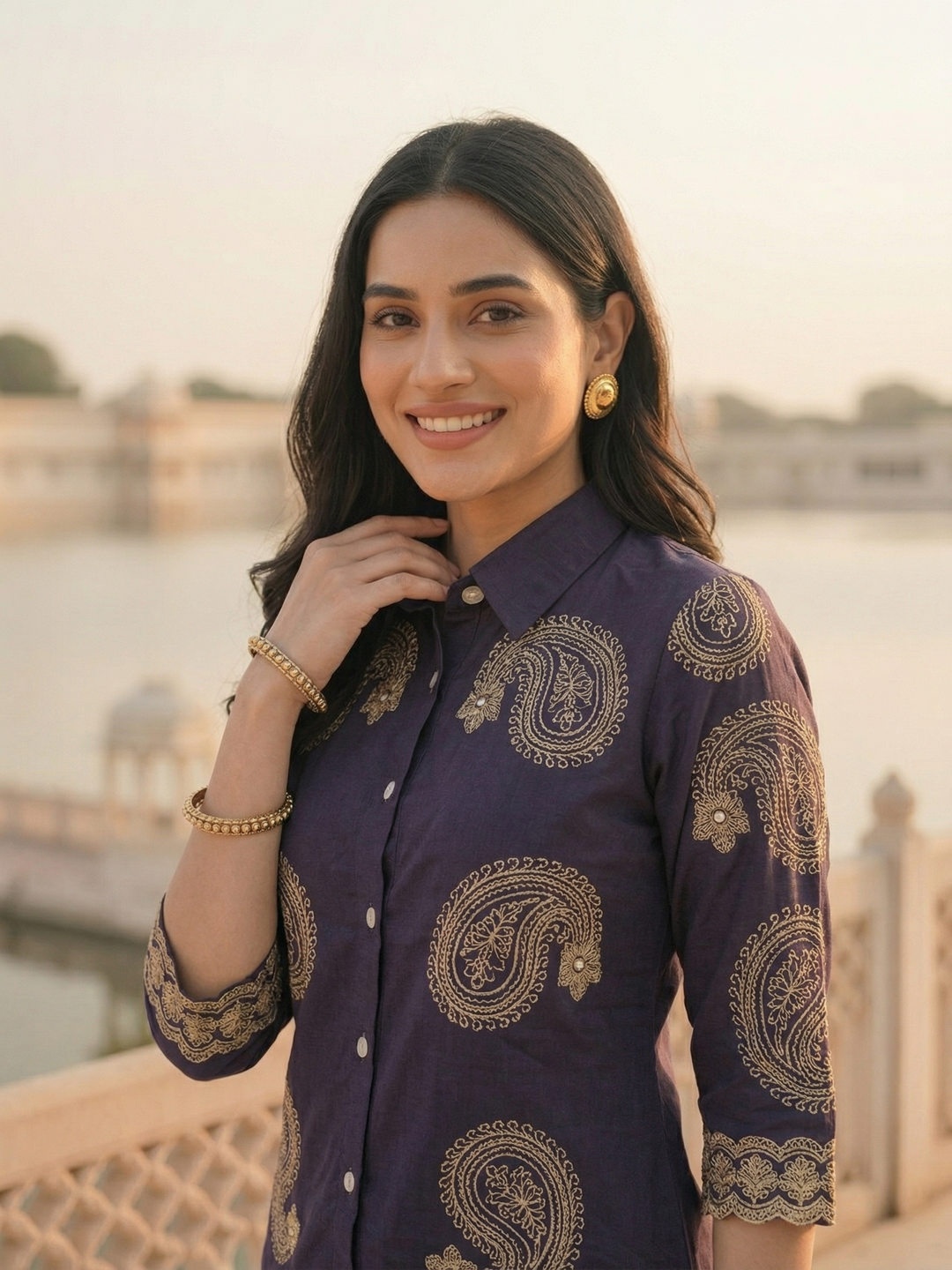 Elevate your everyday elegance with our Solid Threadwork Embroidered Straight Fit Co-ord Set in a rich Dark Purple hue. Crafted from soft, breathable cotton, this set features delicate threadwork embroidery and a classic shirt collar for a refined yet relaxed look. Perfectly tailored for a straight fit, it blends traditional charm with modern simplicity—ideal for brunches, festive gatherings, or stylish daywear.
