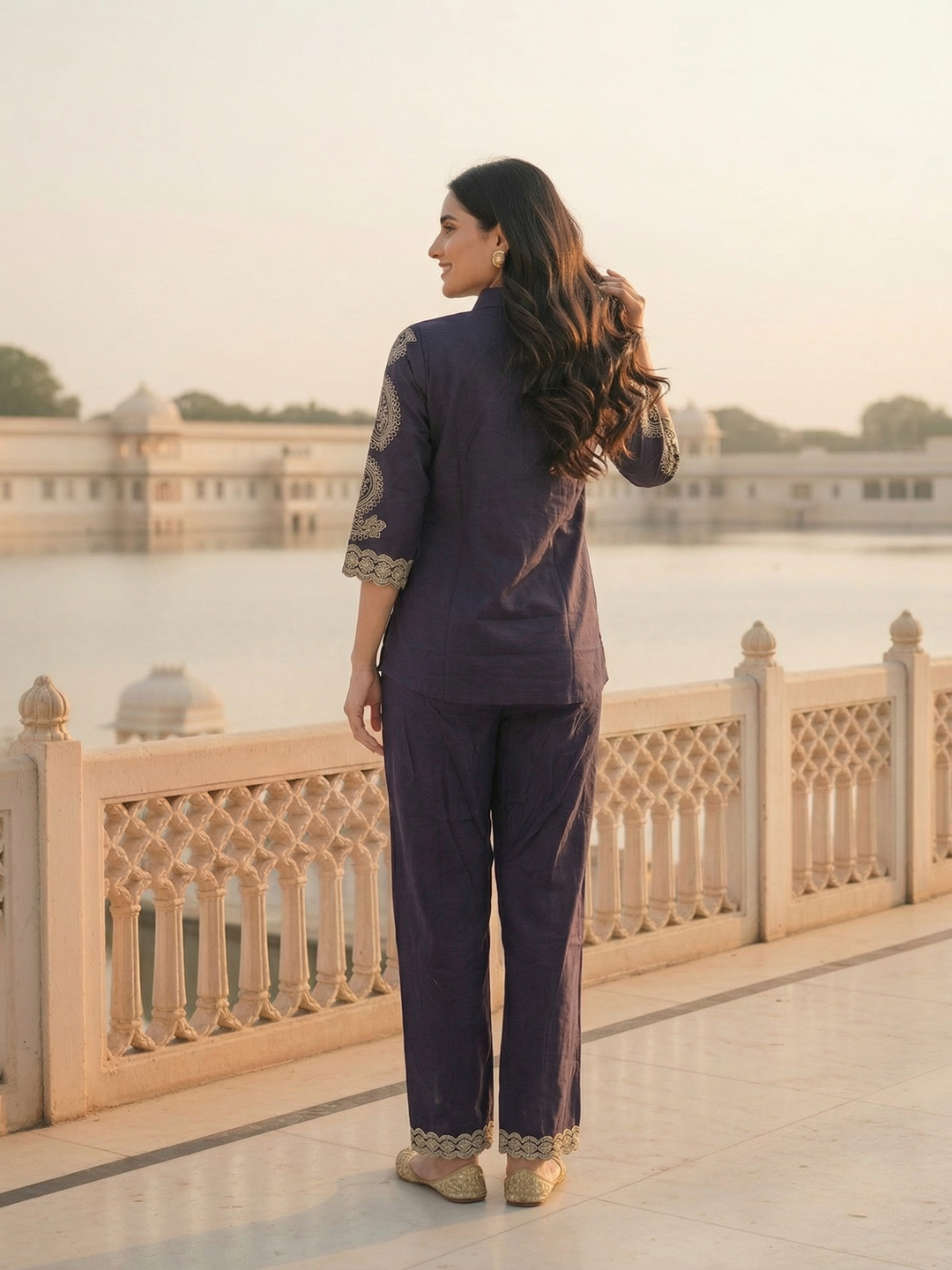 Solid Threadwork Embroidered Straight Co-ord Set - Dark Purple