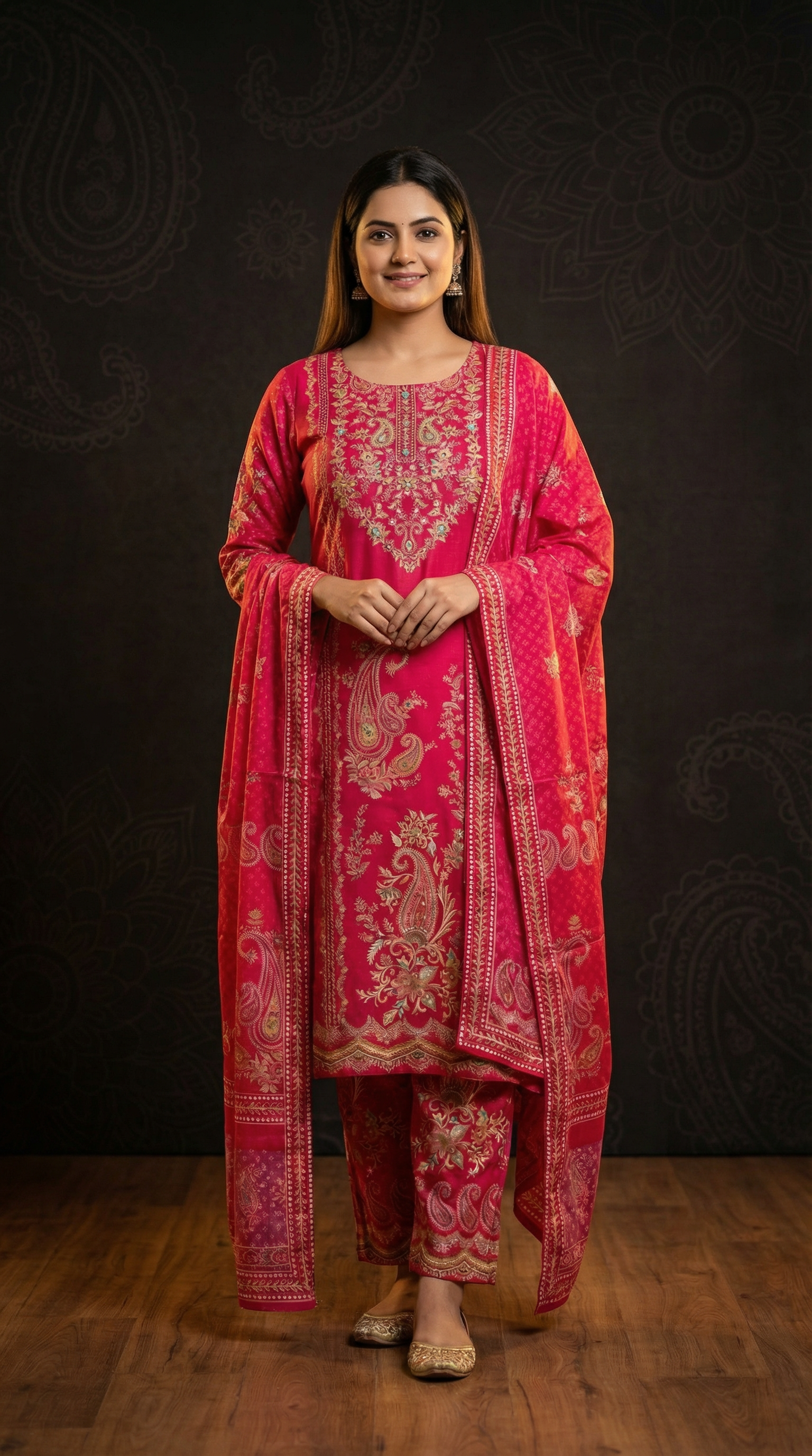 A graceful pink straight kurta in luxurious muslin silk, highlighted with soft ethnic floral prints and a classic round neckline. Paired with a coordinated pant and a beautifully printed dupatta, this elegant set exudes effortless charm—perfect for festive gatherings and refined daywear.