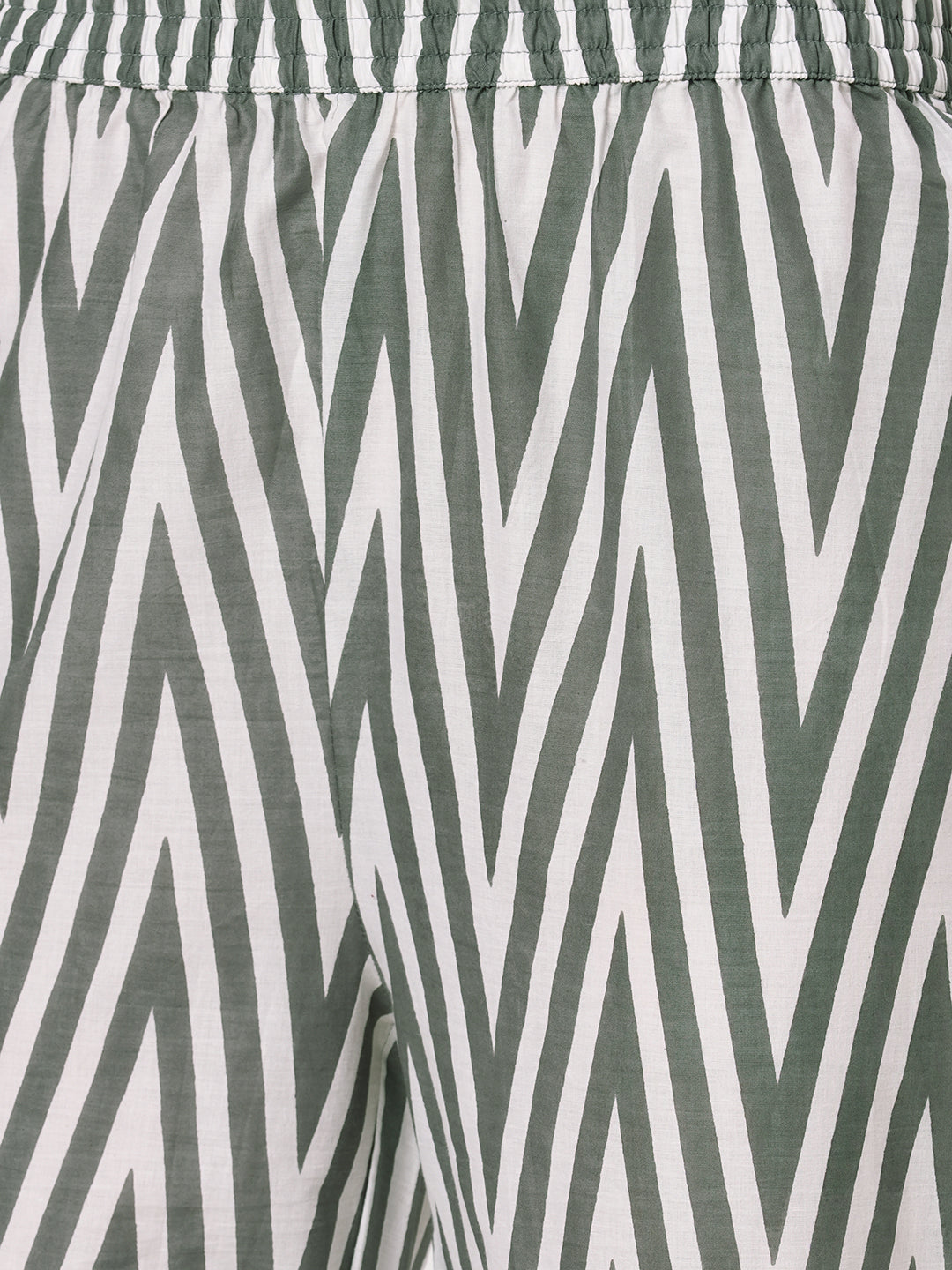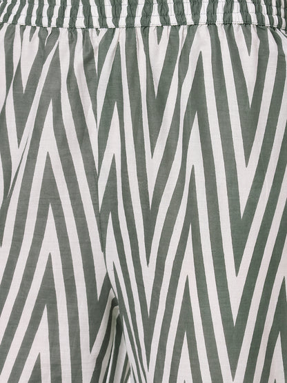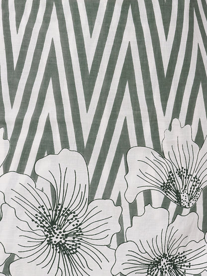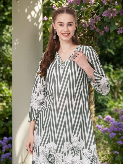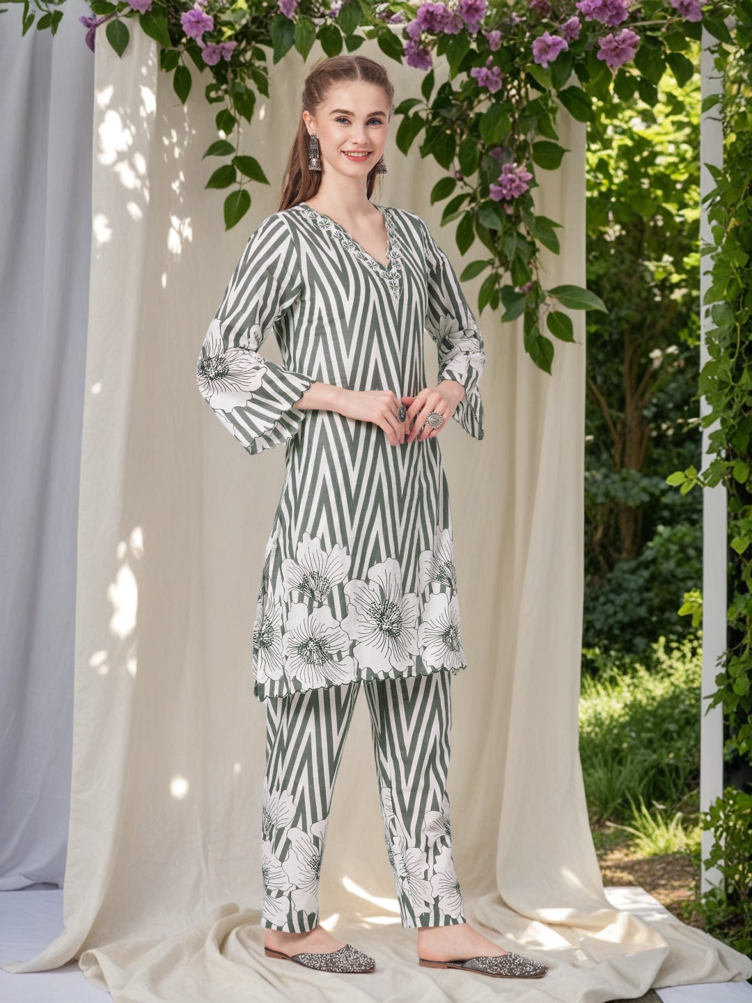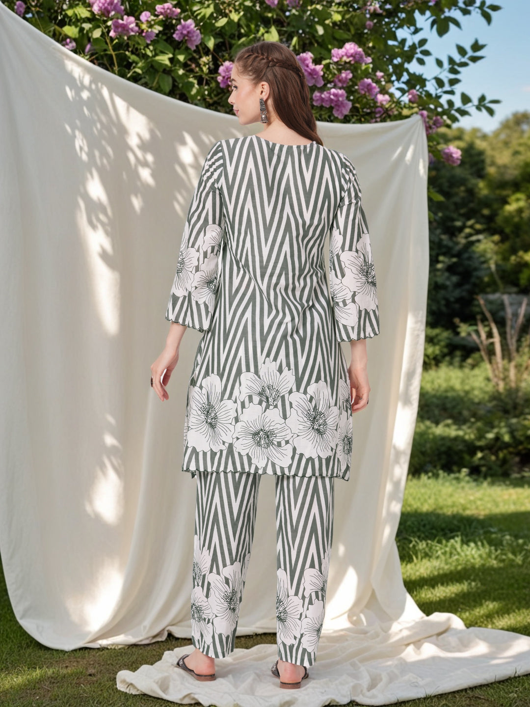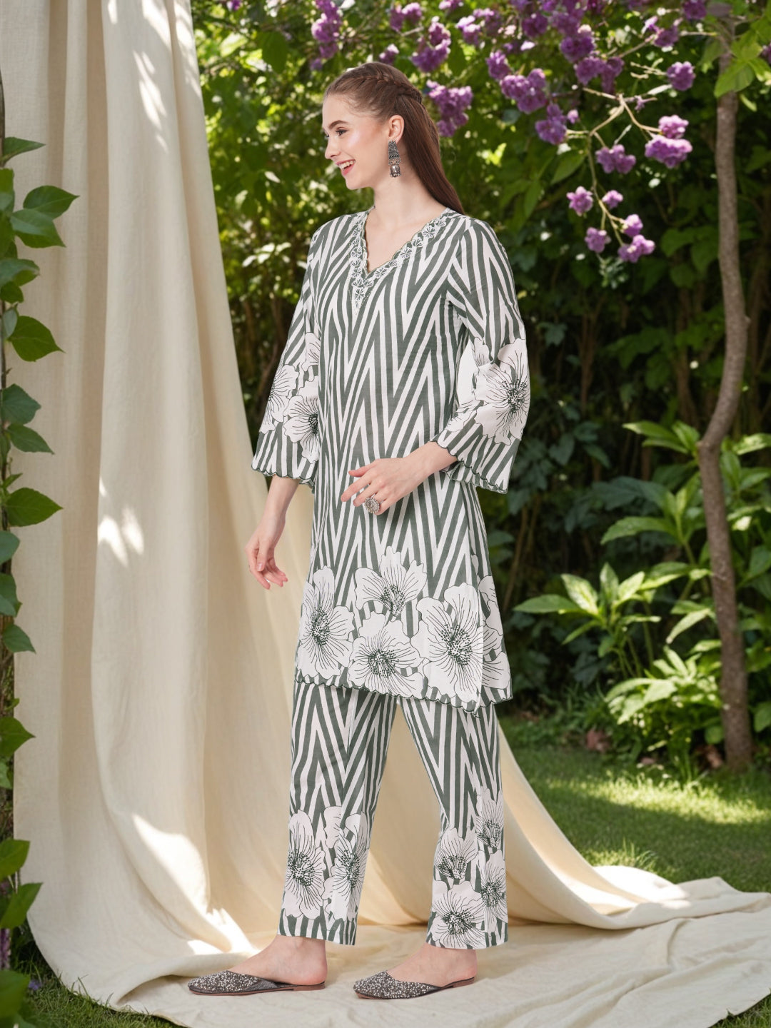 Brighten your wardrobe with the Stripes & Floral Printed Zari Work A-Line Co-ord Set in Grey. Crafted from soft cotton, this vibrant set features a flattering A-line silhouette with flared sleeves and a delicately scalloped V-neckline. Subtle zari work adds a touch of festive shimmer, making it perfect for day events or casual celebrations.